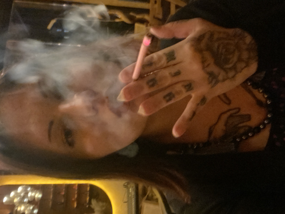 A person with dark hair smoking a lit cigarette. Their tattooed hand, displaying a rose and letters, holds the cigarette. A beaded necklace adorns their neck. Smoke obscures part of their face. The background features indistinct lights and a wooden structure, adding to the dimly lit atmosphere. The image is rotated.