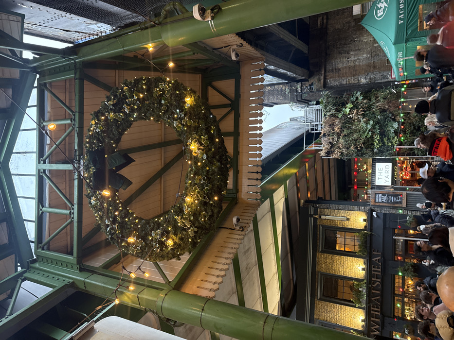 The image captures a crowded area within Borough Market, London, United Kingdom, characterized by industrial architecture and festive decorations. Overhead, a massive circular Christmas wreath, composed of green foliage and numerous warm white LED lights, is suspended from a prominent green-painted iron and steel structure. Additional strings of bare-bulb lights are strung across the ceiling framework. Multiple white dome-shaped CCTV cameras are mounted on the green support beams. Below this overhead structure, a dense gathering of individuals populates the lower half of the frame, dressed in winter attire. To the left, a multi-story building with yellow brickwork and dark window frames is visible, identified by a sign reading "WHEATSHEAF," indicating a pub. Wall-mounted lights illuminate its exterior. To the right of "WHEATSHEAF," a large vertical garden or living wall is present, adjacent to a white sign indicating "THE YARD." In the far right of the frame, a green tent with "TACOS" printed on its side is partially visible, indicating a food stall. Heavy brick and steel railway arches and bridges are discernible in the upper right background, contributing to the urban environment. The scene suggests a bustling, festive atmosphere, likely during evening hours or an overcast day.