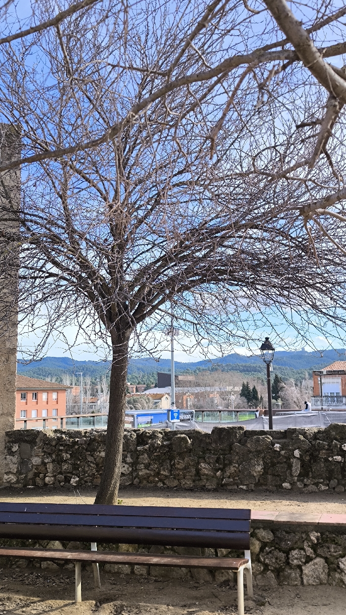 The image portrays an outdoor urban environment in Sant Cugat del Vallès, Spain, under a clear blue sky. In the immediate foreground, a dark brown slatted park bench with light-colored metal legs is positioned on dirt ground. Centrally, a large deciduous tree with an extensive network of bare, intricate branches, indicative of winter, rises, its trunk partially obscured by the bench. Behind the bench and tree, a low, dry-stone wall constructed from irregular, dark-toned rocks extends horizontally. Beyond this wall, a multi-story building with reddish-orange walls is visible on the left. To the right, an ornamental black lamppost with a lantern-style head stands. Further into the midground, a blue advertising billboard and a "Wi-Fi" sign are discernible near a modern elevated walkway or bridge with a transparent railing. A solitary individual, dressed in dark clothing, is seated on a distant structure to the far right. The background features rolling hills or mountains densely covered with green vegetation.