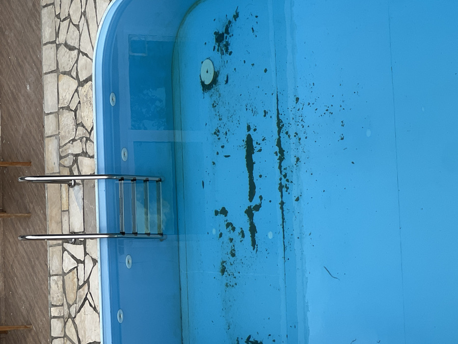 This image displays an outdoor swimming pool, partially filled with water, situated in Sutomore, Montenegro. The pool is lined with a light blue material and contains murky, blue-tinted water. The pool floor is significantly covered with dark, irregular patches and streaks of debris, consistent with organic matter such as algae or sediment. A white, circular drain cover is visible on the pool floor towards the right, surrounded by concentrated debris. A stainless steel ladder, featuring four steps, is positioned at the top left edge of the pool, extending into the water. Multiple white, circular fixtures, likely lights or jets, are embedded along the upper interior walls of the pool; four are visible along the top wall and two on the side wall. The water level is below the top rim, exhibiting a distinct waterline. The area immediately surrounding the pool is paved with irregular, light-colored flagstones, which transitions to a darker, tiled or paved surface further back. Partial views of wooden furniture elements are discernible at the top edge of the image, beyond the pool paving. No individuals are present in the scene, and no direct actions or interactions are depicted.