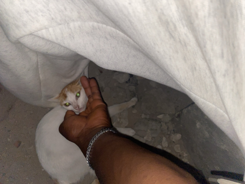 A white cat with orange patches is partially hidden under a white cloth, its green eyes visible. A dark-skinned hand is gently holding the cat's head, with a silver bracelet on the wrist. The surface underneath the cloth appears to be a rough, concrete-like material with visible debris. The lighting is dim, creating shadows around the scene.