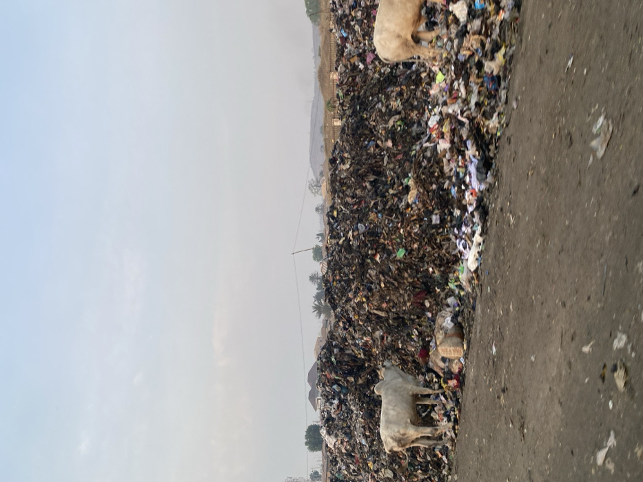 A desolate landscape displays a massive garbage dump overflowing with discarded refuse. Debris stretches across the vista, reaching towards the hazy sky. A cow is visible among the piles of waste, foraging for sustenance. A section of asphalt roadway is also visible, possibly leading towards or away from the landfill.
