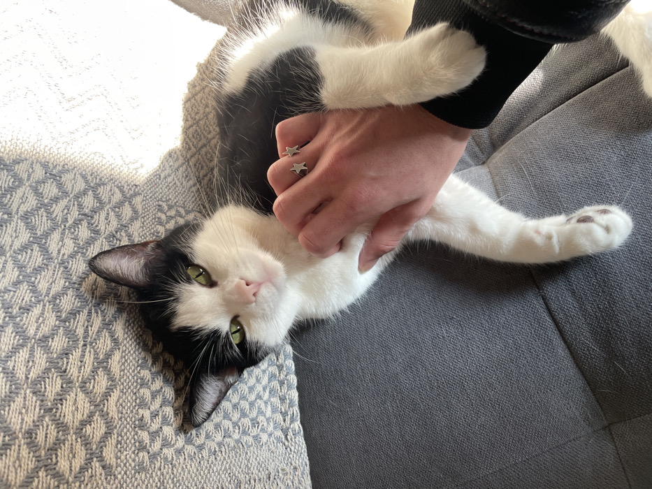 The image displays a black and white domestic cat with green eyes, situated on a grey upholstered surface. A human hand, wearing two silver-colored star-shaped rings on the fourth finger, is gently interacting with the cat's torso. The cat's head is slightly tilted, and its gaze is directed towards the viewer. A light-colored, patterned textile object, likely a cushion or blanket, is positioned near the cat's head. Strong natural light is evident, particularly in the upper right portion of the scene. The setting is indoors, in Lyon, France.