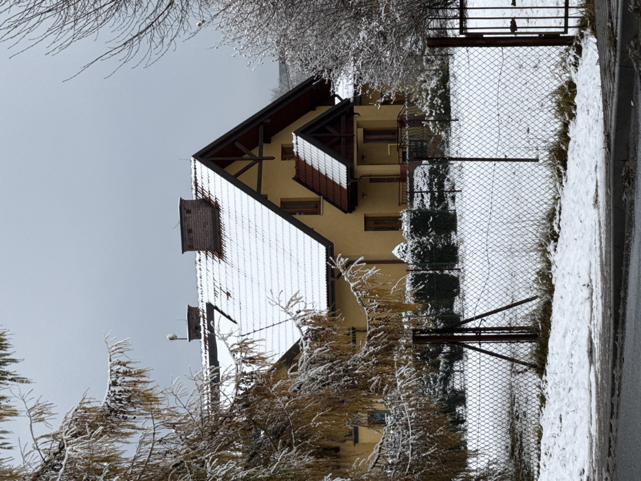 This image depicts a snow-covered residential scene in Krakow, Poland, under an overcast sky. A two-story, detached house with pale yellow stucco walls and dark brown timber accents stands centrally. Its pitched roof, featuring terracotta tiles, is heavily coated in white snow, as are the two brick chimneys, one of which supports a satellite dish. A prominent covered entrance porch with a reddish-brown tiled roof and dark timber framing is visible on the right side of the house's front facade. The property's front yard is entirely covered in a layer of pristine white snow, with trimmed evergreen hedges visible along the house's foundation line, also dusted with snow. A chain-link fence runs horizontally across the mid-ground, enclosing the property, with a dark metal gate visible on the far right. In the left foreground, the snow-dusted, yellowish-brown foliage of a large conifer partially obscures the house. Bare, snow-covered deciduous tree branches frame the right side of the image. The immediate foreground shows a snow-dusted paved surface, likely a sidewalk or road edge. No people or active elements are present in the scene.