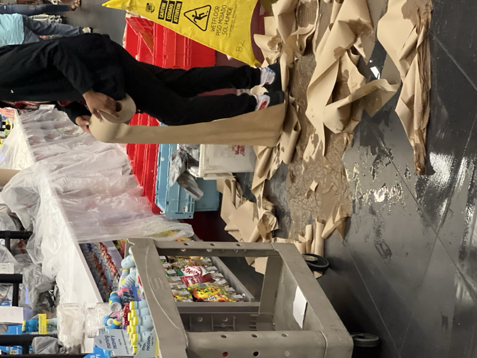 The scene depicts an interior retail or storage environment in Paradise, United States, characterized by a state of disarray and cleanup. The dark tiled floor is visibly wet, with numerous crumpled and damp pieces of brown kraft paper scattered across a significant area. A person, partially visible from the waist up, dressed in black pants, a black long-sleeved top, white socks with red accents, and black athletic shoes, is actively holding and unwinding a large roll of identical brown paper, allowing it to unfurl onto the wet floor. To the right, a yellow "WET FLOOR / PISO MOJADO" caution sign stands. In the background, shelving or tables are covered with clear plastic sheeting, and red and light blue plastic storage crates are present on the floor. To the left, a multi-tiered gray utility cart displays various packaged snacks and small bottles labeled "morning recovery." Another person's lower legs are faintly visible in the far background.