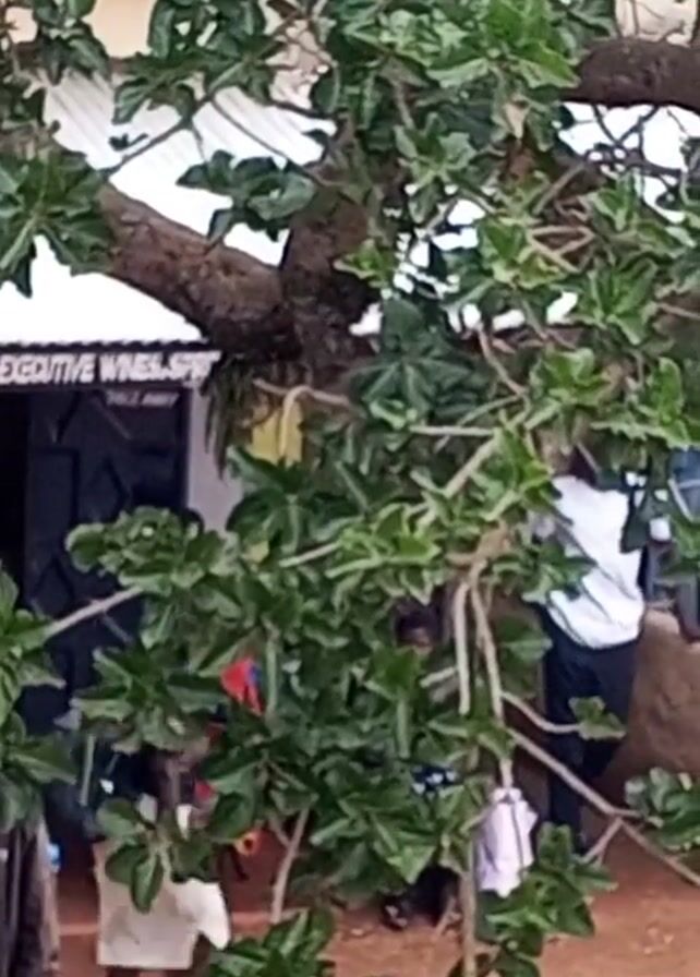 The video presents a slightly obstructed view through a tree of an "EXECUTIVE WINE SPOT" establishment. People are seen standing and walking around in front of the building, some wearing white shirts and dark pants. A red corrugated metal fence is present in the foreground, behind the tree. The scene appears to be outdoors during the daytime.
