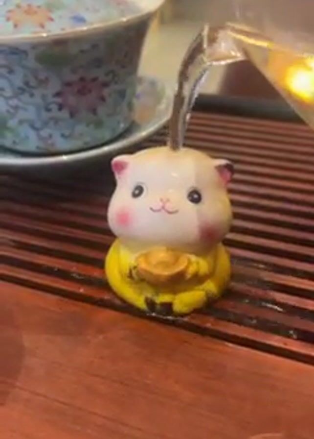 stream of liquid being poured onto the head of a small ceramic cat figurine, through which it flows. The figurine is on a wooden surface and is primarily yellow, with pink cheeks and black and white eyes. It appears to be holding a golden object in its hands. In the background to the left, there's a patterned tea cup and saucer, and behind that a display case. The pouring stops, and a glass of clear liquid is placed next to the figurine.