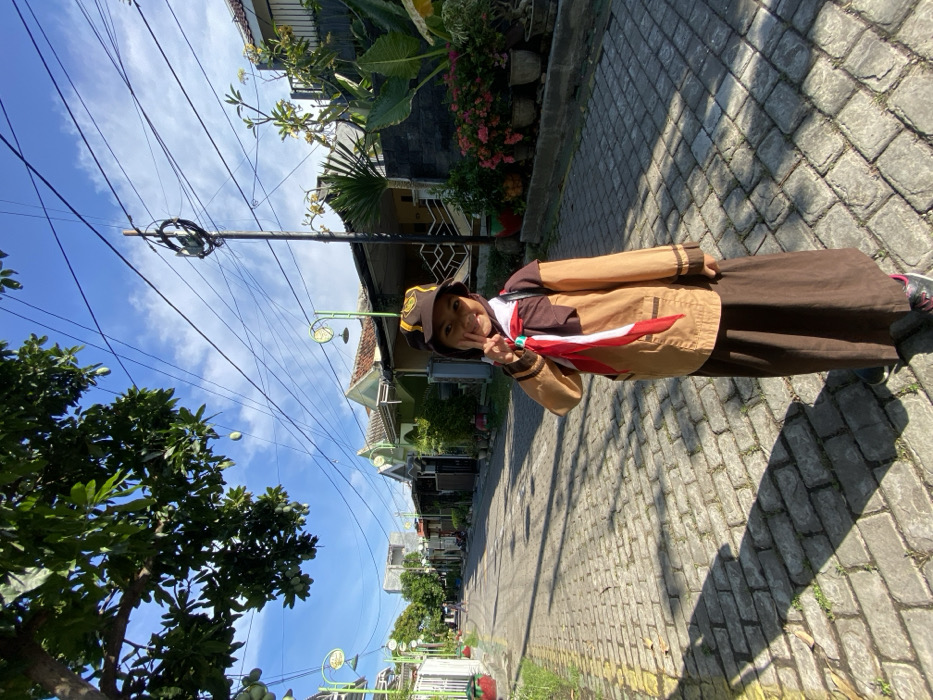 A young girl in a scout uniform stands centered on a brick-paved residential street in the city of Gelam, Indonesia