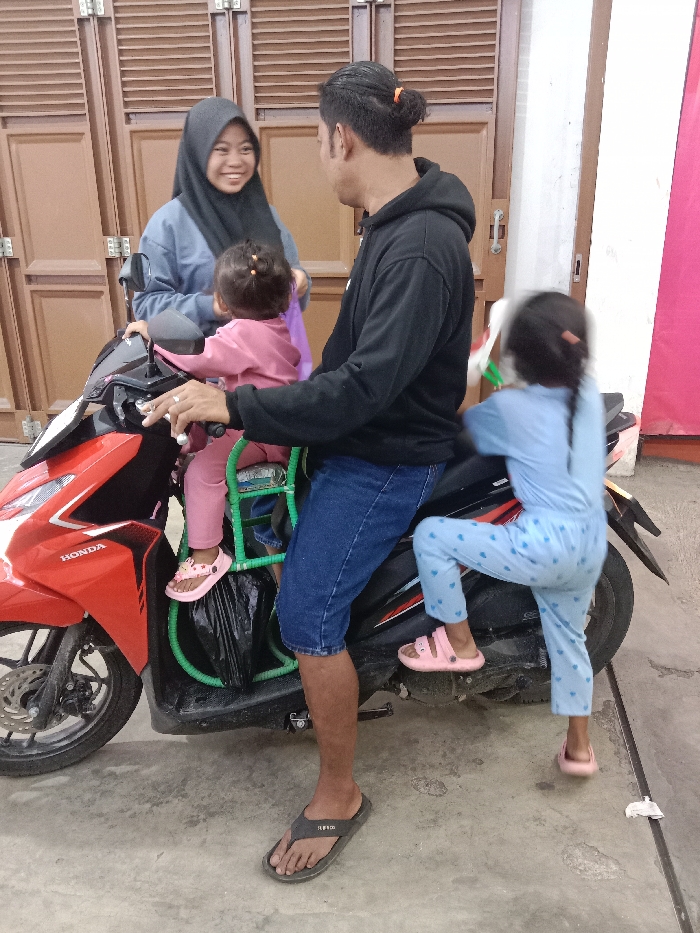 The image captures four individuals—two adults and two young children—gathered around a red Honda motor scooter on a paved surface in Kaliwungu, Indonesia. An adult male, wearing a black hooded sweatshirt, blue denim shorts, and grey flip-flops, is seated on the scooter, facing to his right and looking at an adult female. His dark hair is tied in a bun. The adult female, dressed in a grey long-sleeved top and black hijab, stands to the left of the scooter's handlebars, smiling and looking at the male. A younger child, in a pink long-sleeved outfit and pink sandals, is seated on a green metal child seat secured to the scooter's front floorboard, with her back mostly to the viewer. An older child, wearing a light blue heart-patterned long-sleeved outfit and pink slide sandals, is in motion, climbing onto the scooter's rear seat, with her right foot on a footpeg. The background consists of a brown multi-paneled door or wall to the left and a white wall with a vertical pink banner to the right.