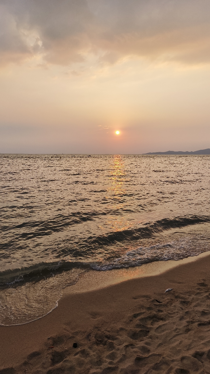 The image depicts a sunset over a body of water, identified as the coast of Pattaya City, Thailand. The sun, a distinct orange-yellow disc, is positioned low on the horizon, slightly left of the vertical center. Its direct reflection forms a prominent golden-orange path across the rippling surface of the water, extending towards the foreground. The water itself exhibits a brownish-orange hue. Along the distant horizon, a faint landmass, possibly hills or mountains, is visible on the right. Several small, dark, unidentifiable objects are present on the water surface near the horizon, suggesting distant vessels. The upper sky displays a mix of orange, pink, and grey clouds, with the area immediately surrounding the sun appearing clearer and brightly lit. The foreground consists of a sandy beach, dark brown-orange in color, with small waves breaking at the waterline, creating white foam. Numerous footprints are imprinted in the dry sand further from the water's edge. A small, dark, cylindrical object is partially submerged in the wet sand on the left. A small, light-colored object, possibly marine debris or a dead organism, lies on the drier sand towards the right side of the foreground. No individuals are visible.