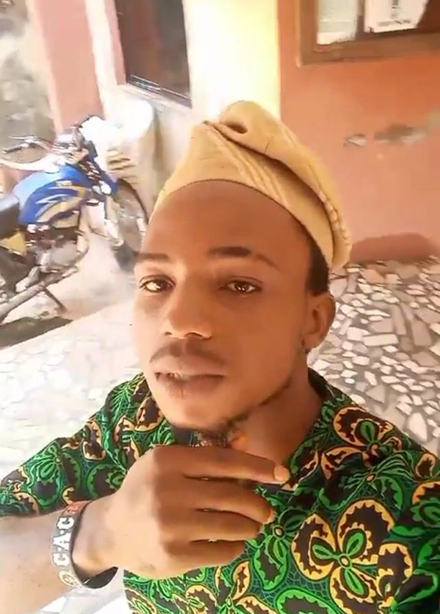 A young man is sitting outside and looking at the camera. He is wearing a green and black patterned shirt and a beige-colored traditional hat. He has a mustache and a goatee. In the background, there is a motorcycle, a door, and some electrical wiring. The floor is tiled in a speckled pattern. The man touches his chin in the first frame and then his chest in subsequent frames.