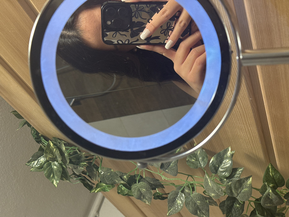 - "This image depicts an indoor scene in Baden, Austria, focused on an illuminated circular vanity mirror with a chrome stand" by FM-T99Iv1, licensed under CC BY 4.0