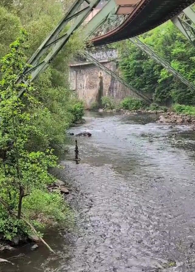 Here is a detailed description of the video: The video shows a gently flowing river running under a monorail bridge. The bridge is supported by a network of green metal supports that extend down to the riverbanks. The bridge itself is brown and appears to be made of steel. The river is relatively shallow, with rocks and pebbles visible on the riverbed. The water is slightly turbulent, creating small ripples on the surface. The riverbanks are lined with green vegetation, including trees and bushes. In the background, there is a stone structure with an arched opening. The sky is overcast, suggesting a cloudy or rainy day. The video appears to be shot from a stationary position, providing a calm and scenic view of the river and the surrounding environment.