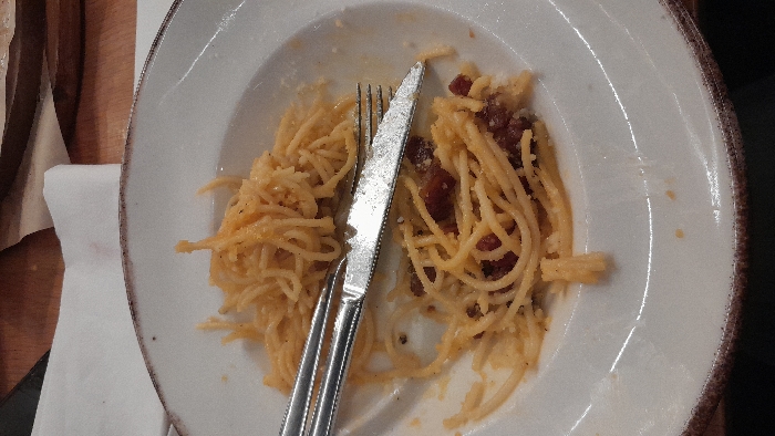 - "A white plate contains a portion of spaghetti carbonara" by FM-gI3X12, licensed under CC BY 4.0