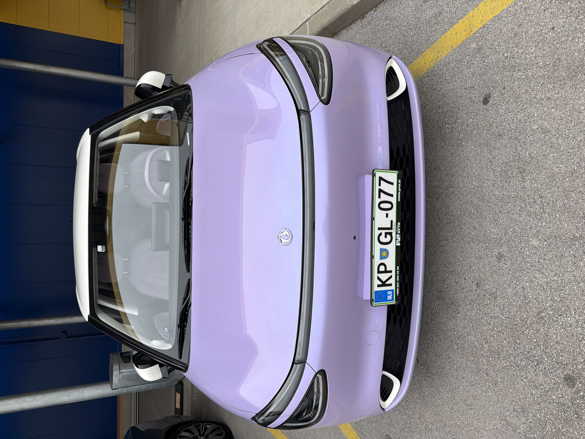 The image captures the front of a light purple car, possibly parked in Ljubljana, Slovenia, as suggested by the vehicle's Slovenian license plate "KP GL-077" and the presence of "+386 (0)1" in the license plate information, the country code for Slovenia followed by a Ljubljana area code