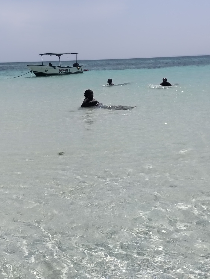 The image depicts a clear, shallow coastal area in Wasini, Kenya, under a bright, hazy sky