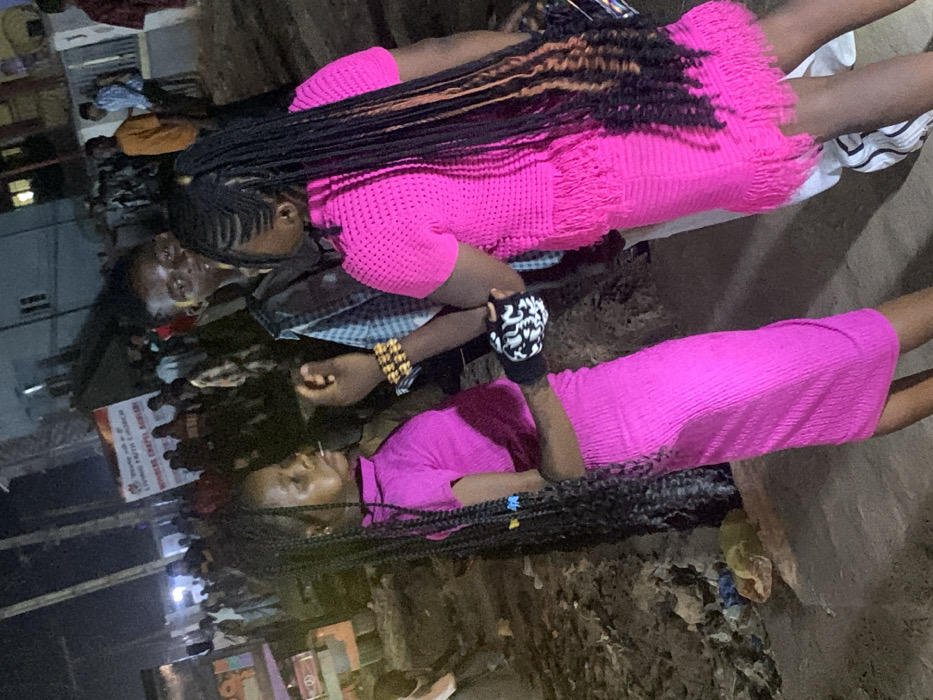 Two women are pictured outside at night, likely at an event. Both wear bright pink outfits; one wears a knitted top and the other wears a dress. Both have long braids. The woman in the dress also wears a black and white glove on one hand. People and signs are visible in the background, illuminated by streetlights. The image is taken from a high angle and appears slightly blurry.