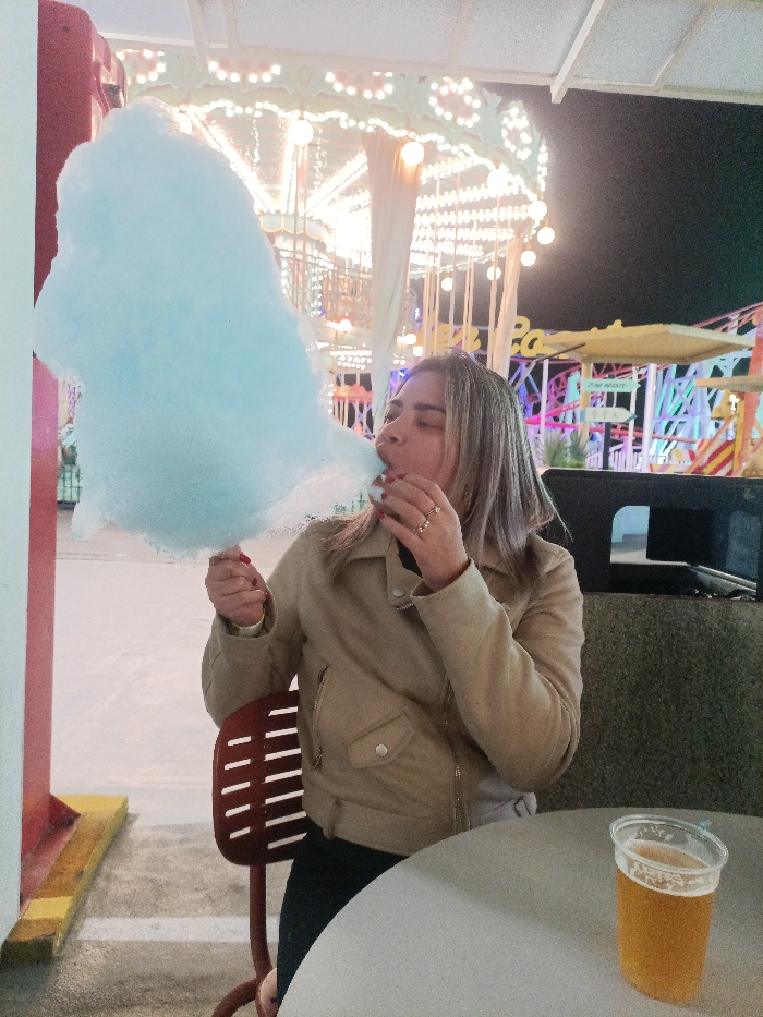 - "A woman in a tan jacket eats blue cotton candy in an amusement park" by FM-63vGE2, licensed under CC BY 4.0