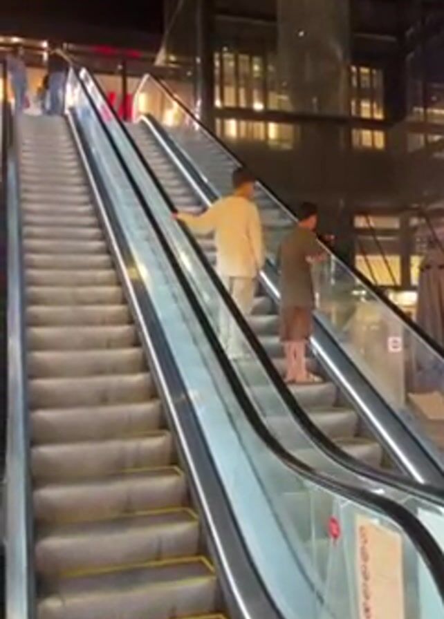 two men riding up a long outdoor escalator at night. The escalator has a brushed metal frame and glass sides. The men are near the top of the escalator, and other people can be seen further up. The man in front is wearing a light-colored sweater and light pants, while the man behind him is wearing a dark shirt and shorts. Both are holding onto the handrail. The background shows a modern building with many windows. The scene is well-lit.