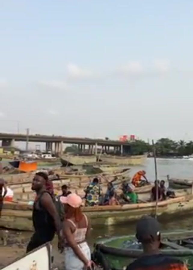 waterfront area with several small boats docked. People are around the boats, some appear to be standing or sitting in them, while others are on the land nearby. The boats look like they might be used for fishing. In the background, there's a bridge or overpass structure with some vehicles moving on it. The weather appears to be clear and the water is relatively calm. A jet ski appears at the end of the clip.