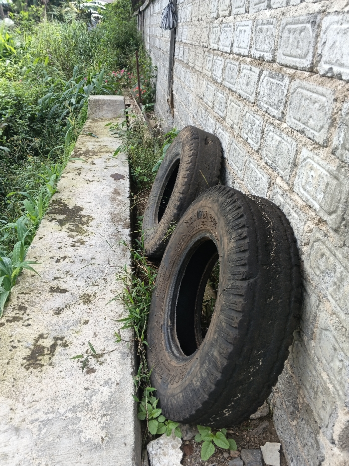 - "Two large, worn tires lean against a block wall beside a concrete path" by FM-11vrG3, licensed under CC BY 4.0