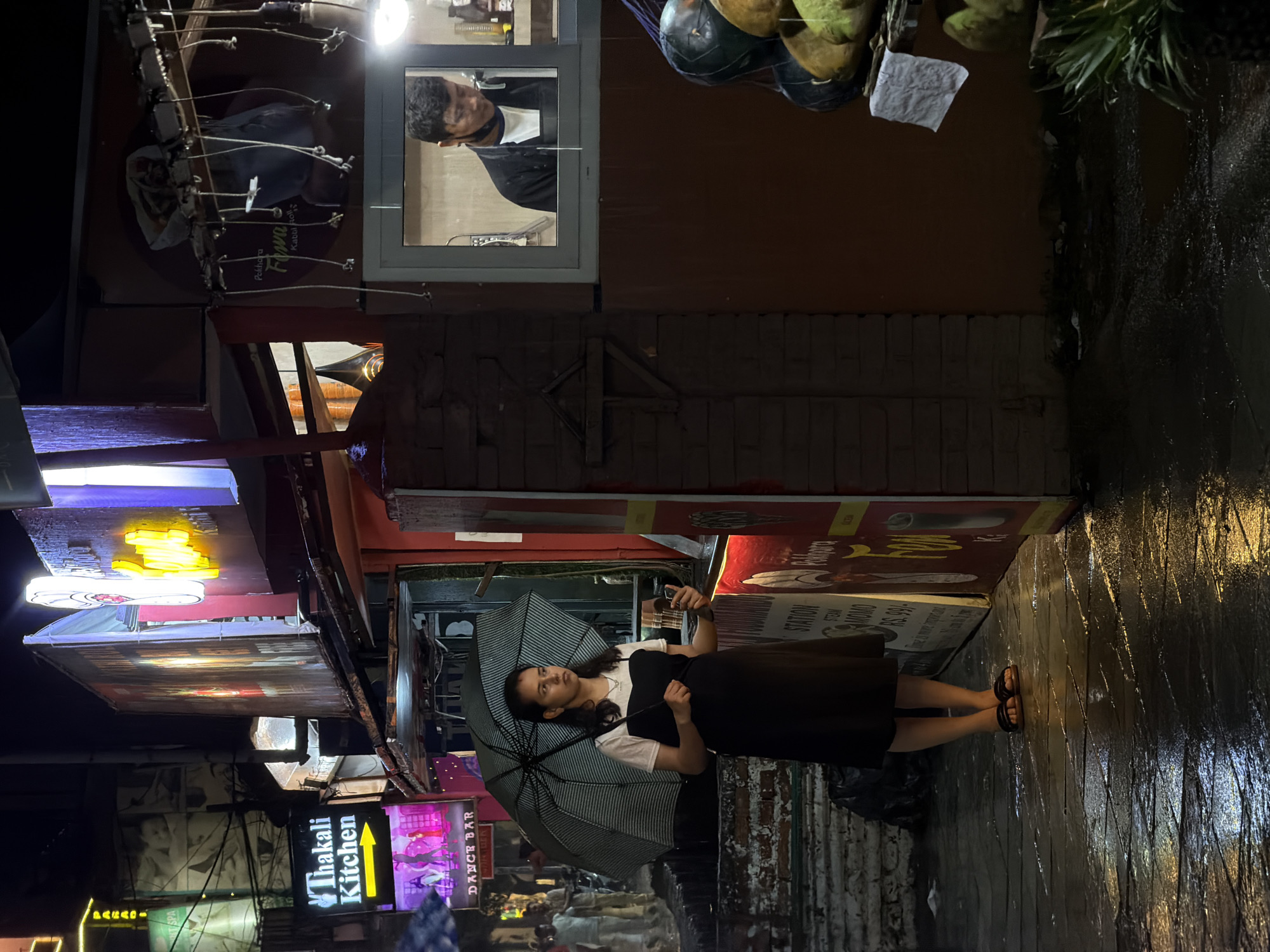 A nighttime photograph captures a woman standing under an umbrella on a wet street in Pokhara, Nepal. She's dressed in a dark dress and a white top, looking to her left while holding a phone in her right hand. Various signs and storefronts line the street, including one that reads "Thakali Kitchen." Above her is a closed shop window with a man looking out. Hanging above the shops are coconuts and what appears to be pineapple. The street is shiny from the rain, reflecting the ambient light of the area.
