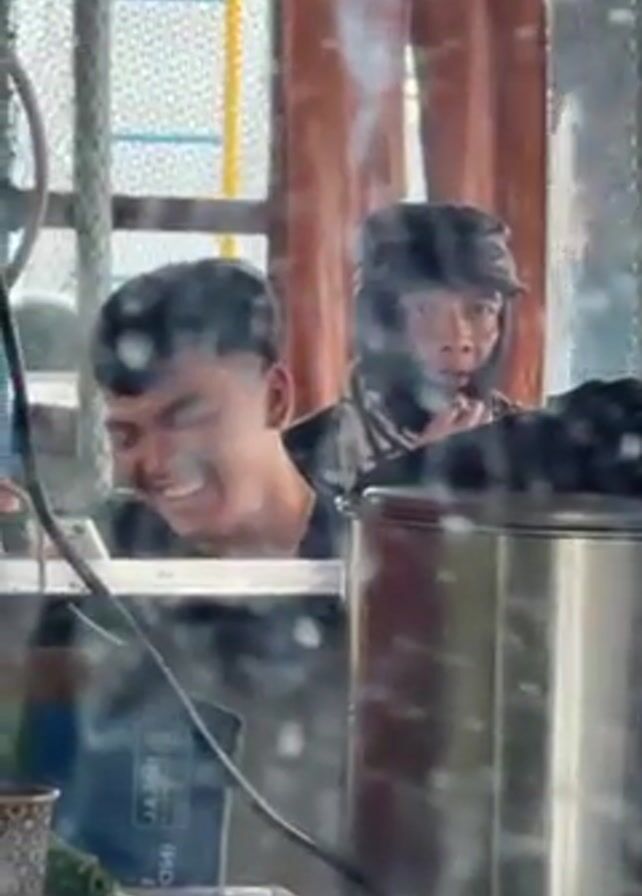 man taking a selfie in a bathroom mirror. The mirror is divided into three sections. Through the right section, two men can be seen in what looks like a food stall. One of the men in the stall is smiling while the other is smoking a cigarette. The man in the bathroom is wearing a tank top and sunglasses. The bathroom has white tiled walls and a simple faucet.