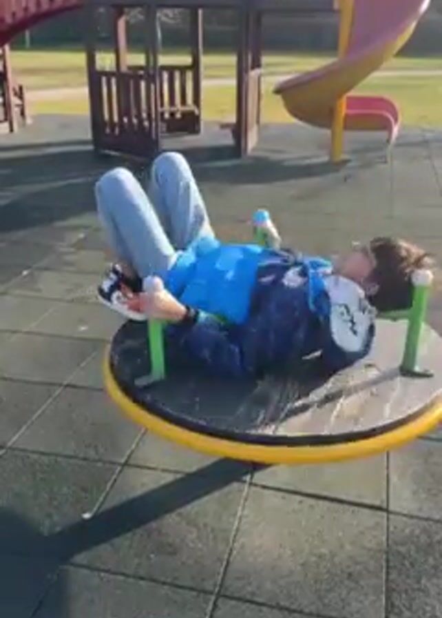 Here's a detailed description of the video: A young boy is lying on his back on a merry-go-round in a playground