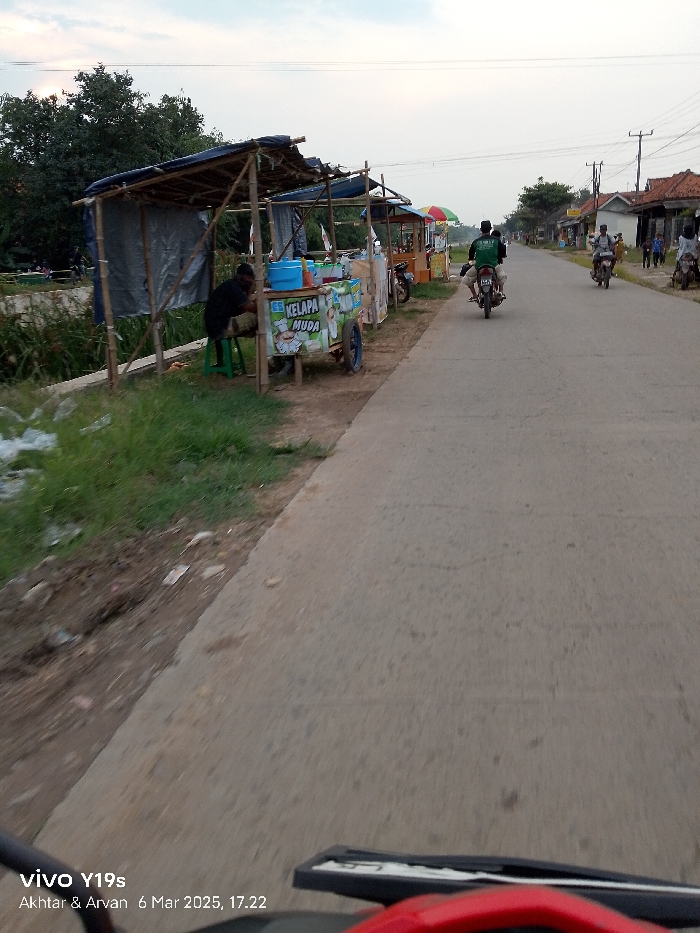 street scene in Kecamatan Gabuswetan, Indonesia, located at latitude -6.438 and longitude 108.024. It is a paved road with a line of food stalls on the right side. The stalls are made of bamboo and have thatched roofs. A man is sitting on a stool in front of the closest stall, which is selling "Kelapa Muda," which translates to "Young Coconut." There are other people in the background, including a man on a motorcycle and a few people walking. The environment is rural with trees and houses on either side of the road. The sky is overcast. The picture was taken from a moving vehicle facing the road. The bottom of the image includes a red handlebar of a motorcycle and a "vivo Y19s" logo. The date and time are "6 Mar 2025, 17:22." The photo is slightly blurred, likely due to the movement of the camera.