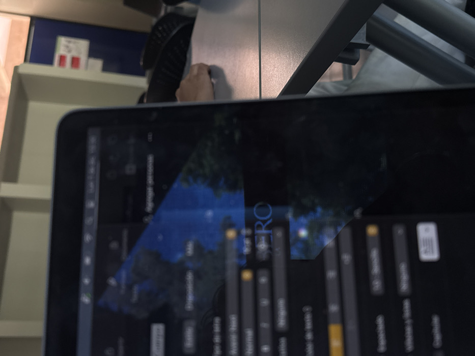 A tablet screen reflects an outdoor scene with trees and a night sky, partially obscuring the device's interface with various settings and sliders. The tablet rests on a gray surface next to a chair and a hand. A shelf with items is visible on the left side of the tablet. The overall perspective is from an elevated angle.