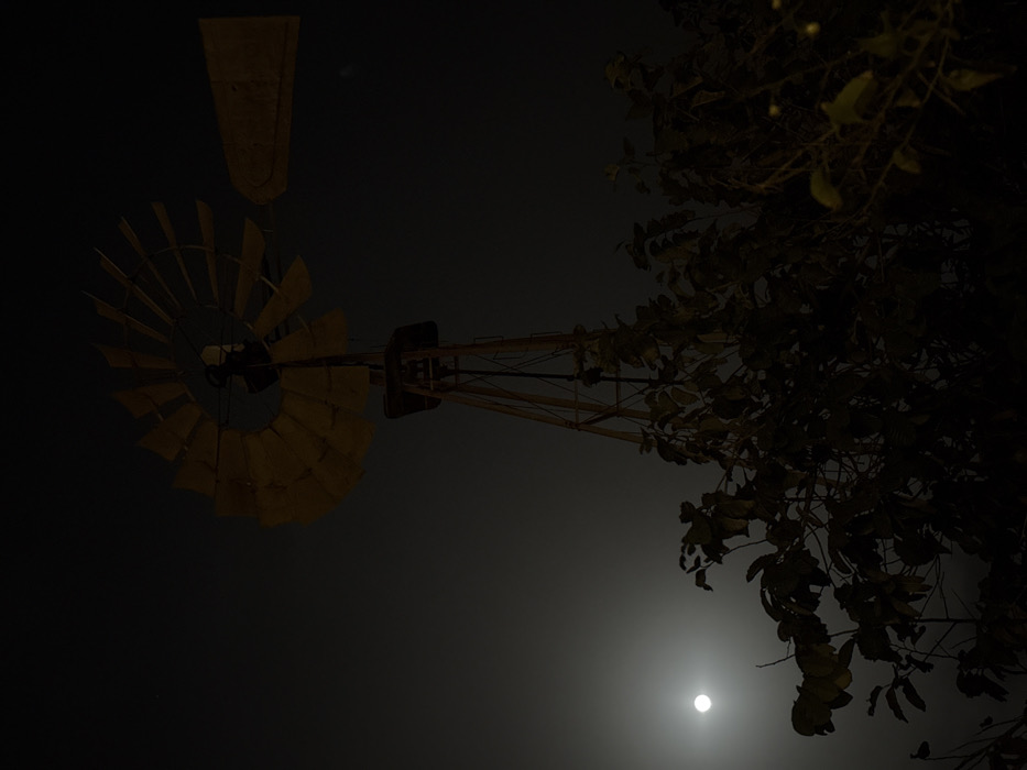 The image displays an outdoor night scene in Palma de Mallorca, Spain. A large, aged metallic windmill, characterized by a multi-bladed fan and a prominent tail vane, occupies the upper-center and right portions of the frame. Its structural elements, including a lattice tower, appear a dull yellowish-orange, possibly from rust or weathered paint. The lower part of the windmill's tower is partially obscured by dark, dense foliage from trees or bushes, which fills the bottom section of the image. A bright, full or near-full moon is visible in the lower-left quadrant of the dark sky, emitting a soft halo, indicating atmospheric haze or thin cloud cover. No individuals are present, and no specific actions or interactions are depicted. The scene is illuminated primarily by the moon, creating strong silhouettes and low-light conditions.