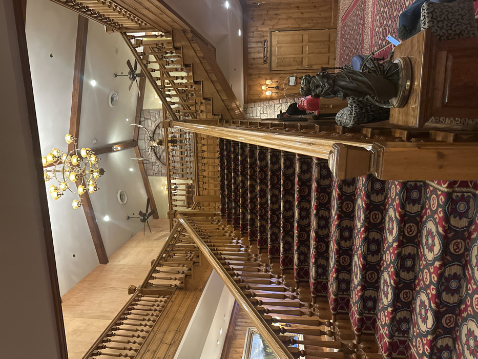 An interior view looking down a grand wooden staircase covered with patterned carpet. A large chandelier hangs from the ceiling, which also features ceiling fans and wooden beams. A stag's head adorns a wall. The staircase ascends to a landing with wooden walls and a doorway. A statue of a kneeling person is near the top of the stairs.