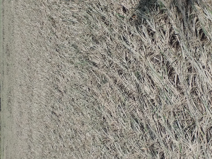 The image displays an expansive agricultural field located in Mns Alue, Indonesia. The field is covered predominantly by flattened, dried, and faded crop stalks, exhibiting colors ranging from light brown and tan to dull green. The vegetation lies horizontally across the terrain, forming interwoven patterns, with discernible dark soil visible beneath the lodged stalks. The field extends into the distance under natural daylight. No individuals, structures, or artificial objects are present within the frame.