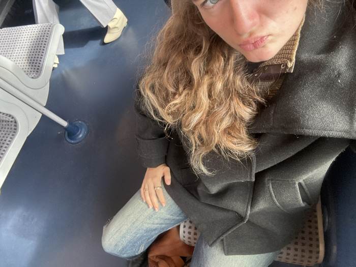 The scene is located within a public transport vehicle in Bondy, France. The image is taken from a high angle, focusing on a young adult female seated in the foreground. She has long, wavy, light brown hair and blue eyes, captured with pouting lips in a selfie-style pose. She wears a dark overcoat, a collared patterned sweater underneath, and light blue denim jeans. Two rings are visible on her left hand. Her right foot, partially visible, shows a light-colored patterned shoe. To her left, the back of a light-colored public transport seat with a patterned fabric is visible, along with a metal support pole anchored to the dark blue floor. Another individual's lower legs and feet are partially visible in the upper left background; this person wears light grey trousers and cream-colored, pointed-toe ankle boots. The floor is uniformly dark blue, and a circular blue pole base is centered in the mid-left of the frame.