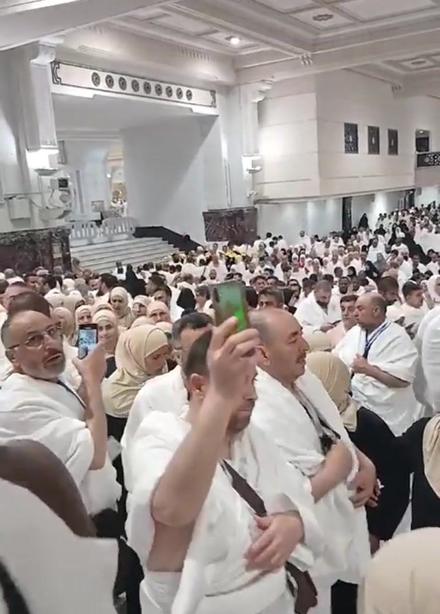 large crowd of people gathered in what appears to be a mosque or grand hall, many of whom are wearing white robes. Some individuals are taking photos or videos with their phones. The hall is brightly lit and decorated with architectural details. There is a raised platform with steps in the distance. The crowd appears dense and active, with people moving and talking.