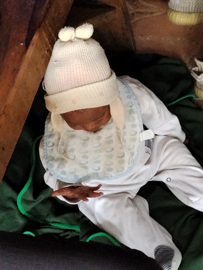 This scene is located in Fagge A, Nigeria. A single infant is depicted, seated or reclined on a dark green fabric. The infant's head is bowed forward, obscuring facial features. The individual wears a white knitted hat with two top pom-poms and ear flaps, a light blue and white patterned bib, and a white long-sleeved onesie with a visible snap closure on the left hip area and striped foot coverings. One small hand, with fingers splayed, is visible on the infant's left side. The background consists of rough wooden structural elements and a rugged brown surface. In the upper right quadrant, a coiled yellow object and a piece of white fabric are partially visible. A dark, indeterminate object occupies the lower foreground.
