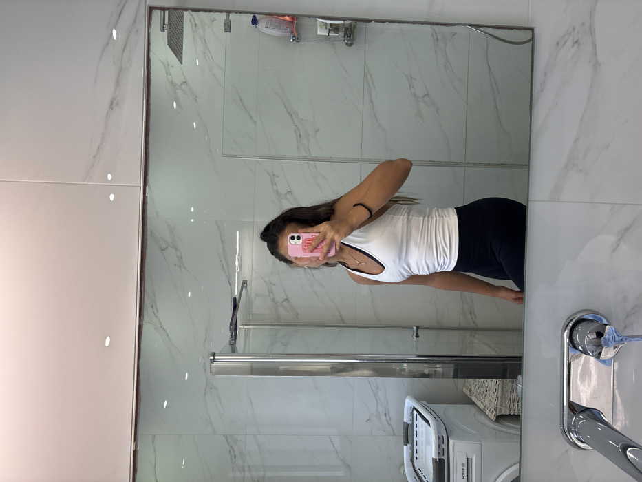 An individual is depicted taking a mirror selfie in a modern bathroom located within a private residence in Rishon LeZion, Israel. The specific address or neighborhood within the city is not discernible from the image. The person, appearing to be female, is positioned in front of a large, unframed wall-mounted mirror. Her face is obscured by a light pink smartphone held in her right hand, directed towards the mirror. She is wearing a white sleeveless top with a V-neckline and a black trim, black athletic leggings, a dark bracelet on her left wrist, and a necklace with a small pendant. Her hair is pulled back. The bathroom's interior, visible in the mirror's reflection and partially in the foreground, features white ceramic wall tiles with grey veining. The ceiling is white with recessed spotlights. To the left of the person's reflection, a white front-loading washing machine (partially identifiable as Bosch brand) is visible, topped with a white plastic laundry basket with grey handles. A woven basket is beside the washing machine. To the right, a glass shower enclosure with a metallic frame and door handle is present. Inside the shower, a square chrome rainfall showerhead is mounted on the ceiling, and a multi-tiered shower caddy holding various toiletries, including a purple bottle, is affixed to the wall. In the bottom foreground, outside the mirror's reflection, a chrome-plated wall-mounted faucet is partially visible above a white tiled surface.