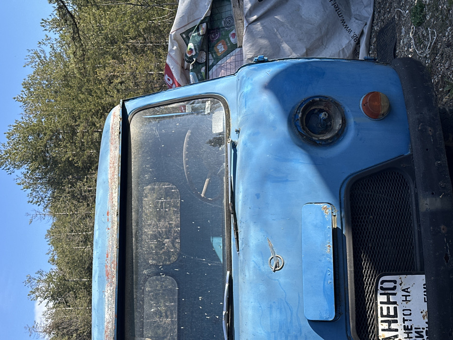 The image displays the front aspect of a faded light blue UAZ-452 utility van, located in Srednogortsi, Bulgaria