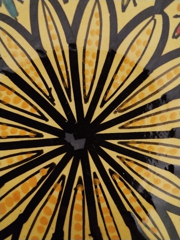 A vibrant close-up showcases a stylized, sun-like design. Black lines radiate from a central point, framing yellow, petal-shaped segments. These yellow segments are adorned with evenly spaced orange dots. The design creates a sense of radial symmetry and contrast. The colors are bold and high in saturation. The style suggests a decorative tile or ceramic piece.