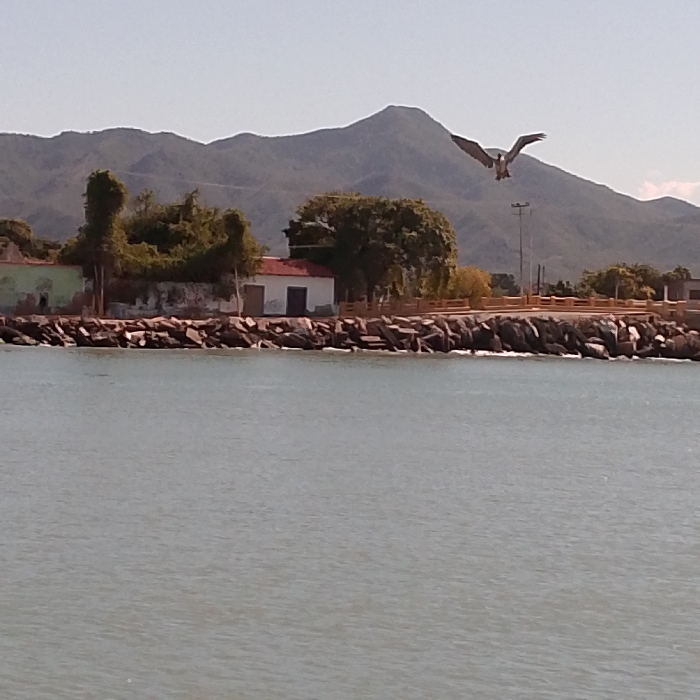 coastal scene with a calm body of water in the foreground. A rocky breakwater stretches across the middle ground, topped with sparse vegetation, a building with a red roof, and a light post. A bird flies just above the breakwater with outstretched wings. In the background, a large, gently sloped mountain rises against a pale blue sky. The overall tone is peaceful and serene.