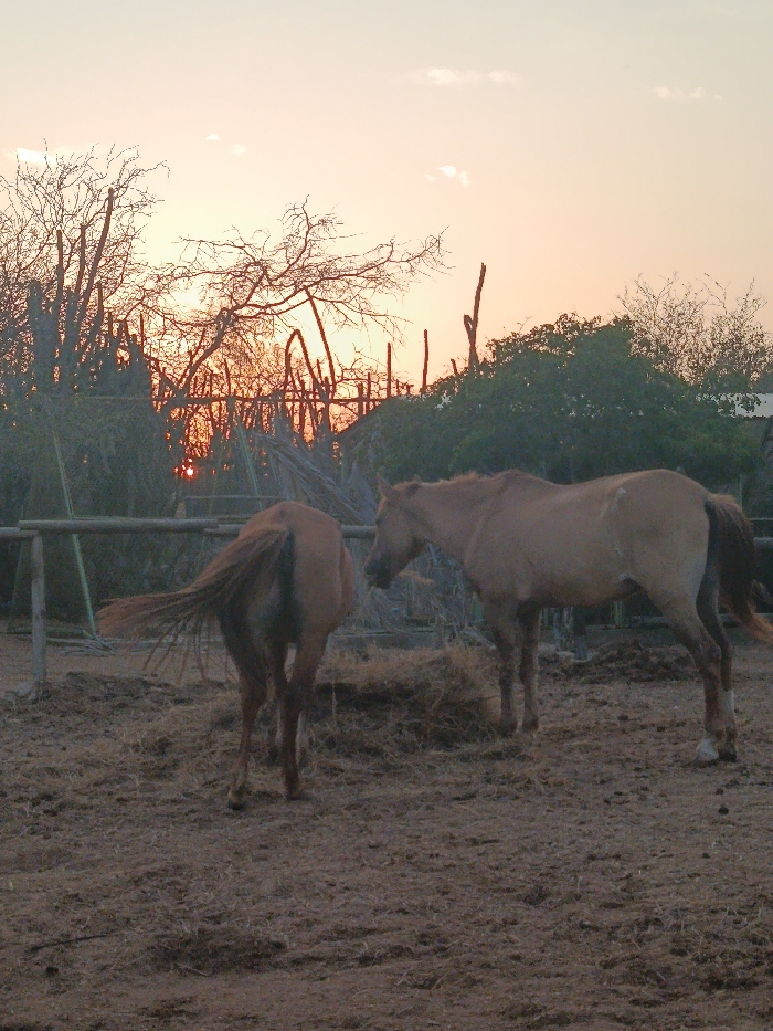 The image captures a rural outdoor scene at either sunrise or sunset in Guayacancito, Venezuela. Two light brown horses are present within a dusty, earthen enclosure. The sky exhibits warm orange and pink tones, with the sun's glow partially visible through sparse, silhouetted vegetation on the left. A light brown horse with a dark mane and tail stands in the mid-ground, positioned toward the right side of the frame, its head lowered near a small pile of hay or dry grass on the ground. To its left, a second light brown horse is observed from a rear perspective, facing away from the viewer. Its tail is visible and appears to be swishing or elevated. A horizontal, multi-rail fence constructed of light-colored wood or poles runs across the mid-ground, separating the horses from the background. The background features various types of vegetation, including several tall, leafless trees, prominent columnar cacti, and denser green foliage on the far right, all silhouetted against the brightly illuminated sky. The ground of the enclosure is dry, uneven, and appears to be composed of dirt or packed earth with scattered organic debris.