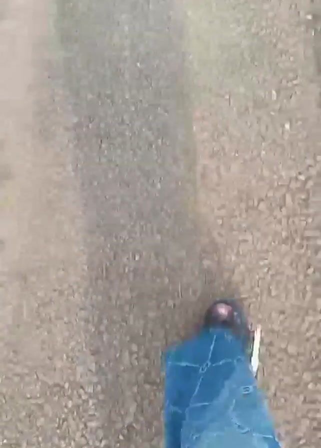 A person is walking on a paved road. The camera angle is from above, looking down at the person's legs and feet as they move. The person is wearing blue patterned pants and sandals. The road surface is made of small pebbles or gravel. There are a few scattered pieces of debris on the road. The lighting is bright and natural.