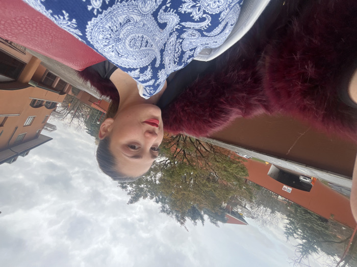 A young adult female is depicted in a close-up selfie-style photograph taken outdoors in Segrate, Italy, under an overcast sky