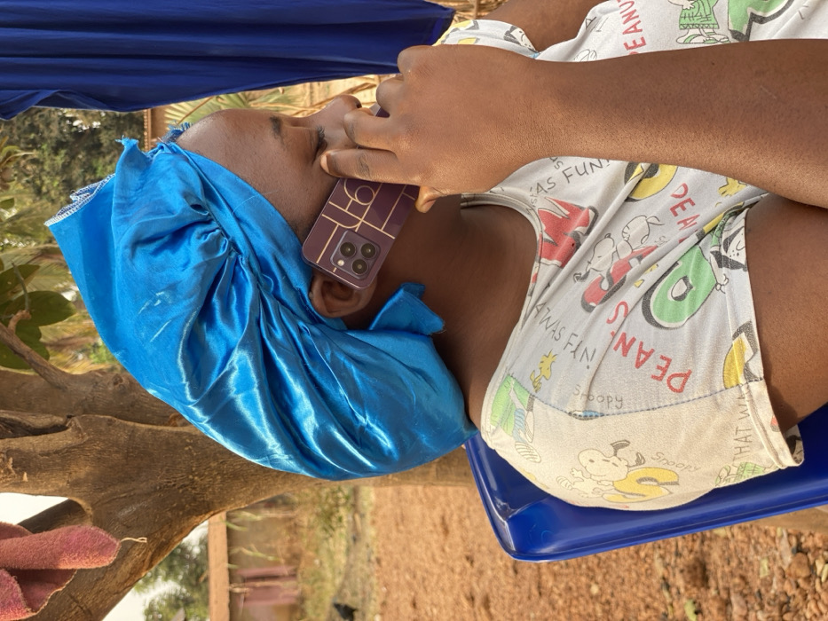 A person is lying down, holding a mobile phone to their ear. They are wearing a blue silky bonnet and pajamas featuring Snoopy characters. They are resting on a blue plastic chair. The background shows an outdoor scene with a tree and dry grass, suggesting it might be a rural area. The scene is lit by natural light.