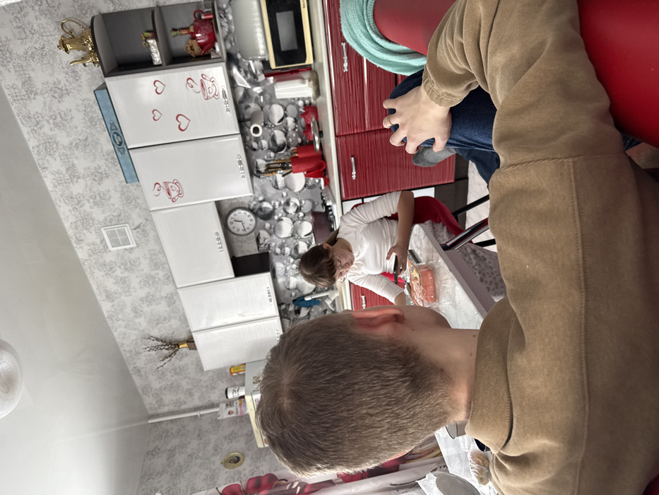 The image depicts an interior domestic scene, specifically a kitchen and dining area within a residence in Зура, Russia. In the foreground, an individual is viewed from behind, exhibiting short, light brown hair and wearing a brown collared shirt. This individual is seated in a red chair, with a light blue blanket draped over a portion of it. A ring is visible on the ring finger of their left hand, which rests on their knee. In the midground, a female individual, likely a teenager, is seated at a white table. She has brown hair, wears glasses, a white long-sleeved top, and red pants, and is looking down at a smartphone held in her hands. A clear plastic container of orange-colored food, appearing to be processed meat slices, is on the table in front of her. The table is partially covered by a light-colored fabric with dark, abstract speckles. The background reveals a kitchen area featuring white upper cabinets adorned with red heart and coffee cup decals, and red lower cabinets equipped with silver handles. A grey and black circular-patterned backsplash is visible between the upper and lower cabinetry. A wall clock is mounted above the backsplash, and a cream-colored microwave oven is present on the countertop. A golden teapot and vases containing bare branches are displayed on shelves positioned above the upper cabinets. The walls are covered in light grey wallpaper with a subtle patterned design. A white ceiling light fixture and a white ventilation grille are also visible.