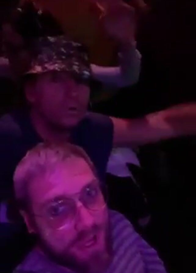 A selfie-style video shot at night depicts a close-up of a man with a beard and glasses, wearing a purple and white striped shirt. Behind him, another man in a tank top and patterned bucket hat is visible, followed by another man wearing a yellow shirt. The man in the bucket hat gestures with his hands as if dancing or enjoying music. The video moves around slightly, showing a glimpse of a low ceiling draped with fabric, including white and purple sections. The primary subject of the video continues to look at the camera, his face illuminated by purple light. The overall impression is that they are in an underground space, possibly a club or venue, enjoying the music and atmosphere.