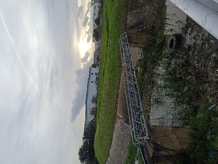 landscape with a cloudy sky and the sun peeking through. A building with a blue roofline is visible in the distance. There is a grassy area and a ditch with some debris and vegetation. A metal structure or framework is lying on the ground alongside the ditch. A tire is partially submerged in the water in the ditch. There are also some large white pipes visible near the edge of the ditch.