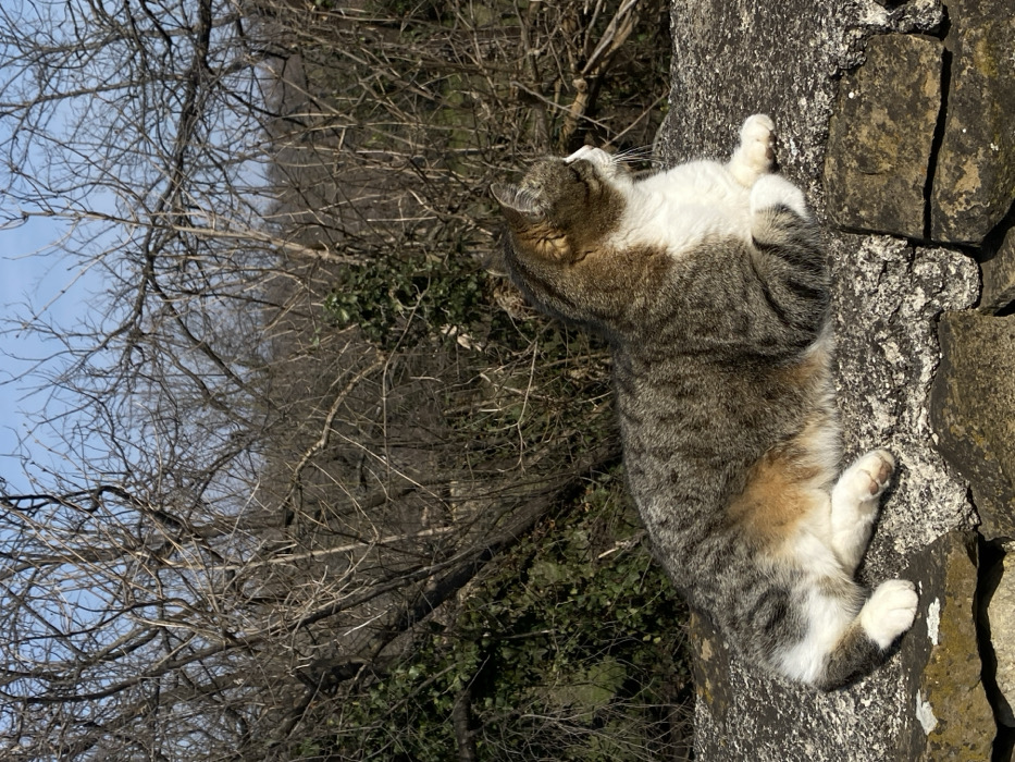 - "A domestic cat is depicted lying on a weathered, rough-hewn stone surface in Arbanassi, Bulgaria" by FM-PFEbq2, licensed under CC BY 4.0
