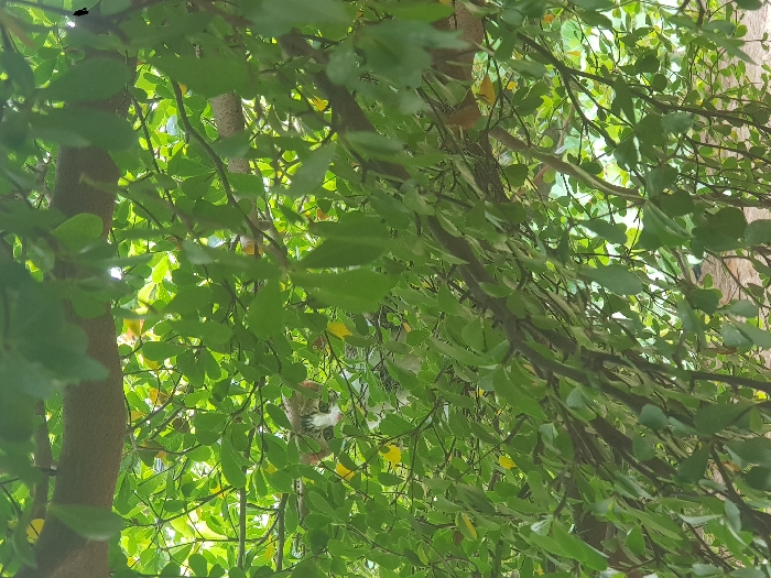 The scene depicts a domestic cat partially obscured by dense green foliage, likely a tree canopy, in Adankolo, Nigeria