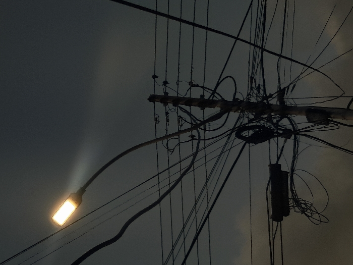 - "A street lamp glows on a dark street, its light illuminating a pole teeming with entangled electrical wires" by FM-2tAXJ2, licensed under CC BY 4.0